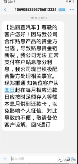 近日,有市民反映:自己在亚太汽车城里面贷款买了一辆车,可就在1月14日那天收到一条浩丽鑫汽车公司发来的短信,短信中写着:“因与我公司合作的贴息产品的资金方出逃,导致资金断裂...为了避免影响个人征信,购车人需自己承担每个月的贴息部分”。顿时车主们都傻眼了,算下来几年的贴息部分也不是一笔小数目。