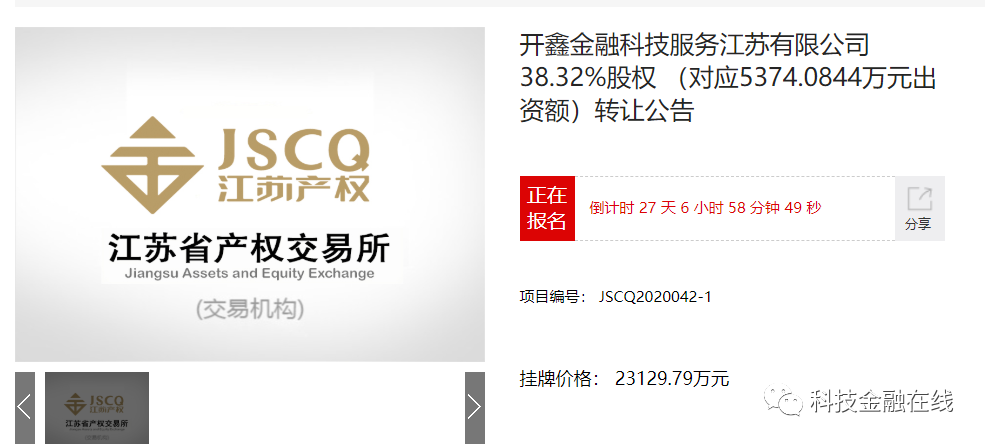 10月21日,一则“开鑫金融科技服务江苏有限公司38.32%股权转让公告”在江苏省产权交易所上线,转让价格为2.31亿,股权转让方为开鑫贷(现在更名为开鑫科技)两个股东——国开创新资本投资有限责任公司和国开金融有限责任公司。