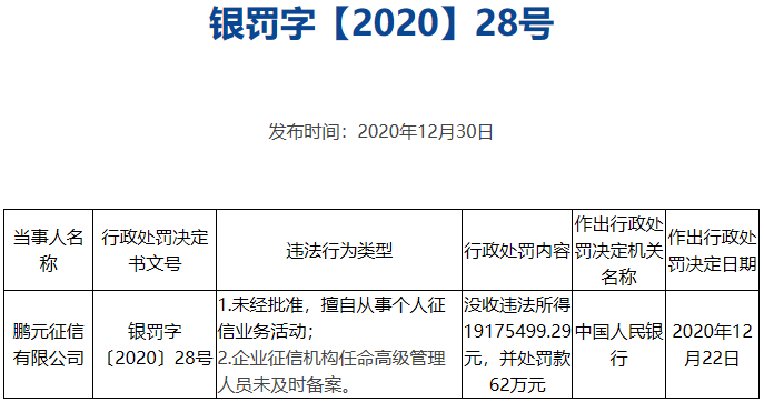 近日,中国人民银行官网公布一则罚单显示,鹏元征信有限公司因未经批准擅自开展个人征信业务及企业征信机构任命高管未及时备案被没收违法所...